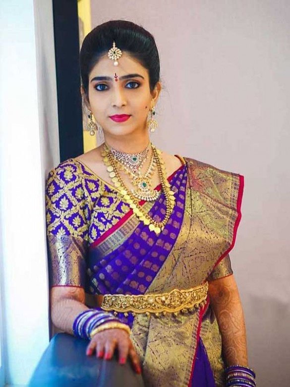 A full sleeve blouse covered in heavy embroidery is the type of blouse which comes off as a royal choice for a Kerala wedding. These blouses can be obtained in dark colours like red or purple and look perfect with golden or silver colour embroidery. Go for whichever colour matches your skin tone. These blouses are also a life saviour in the winter season as your hands remain covered in thick clothing!