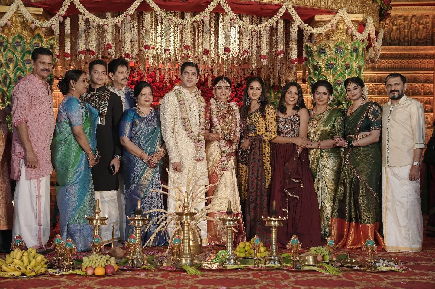 Asha Sarath came to the wedding wearing a green saree. Uthara can be seen in a red saree. Pictures of Asha Sarath welcoming Utharey and Aditya to the wedding venue are going viral on social media.